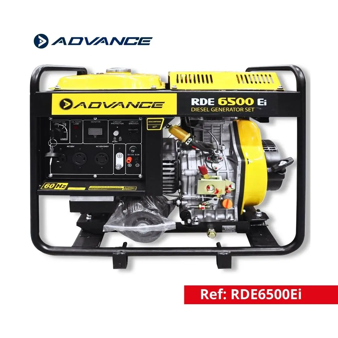 La Planta Eléctrica Diesel Advance RDE6500Ei está diseñada para ofrecer energía estable y eficiente cuando más se necesita. Su configuración bifásica, motor a 3600 RPM y sistema de regulación AVR garantizan un suministro confiable para equipos eléctricos y herramientas.